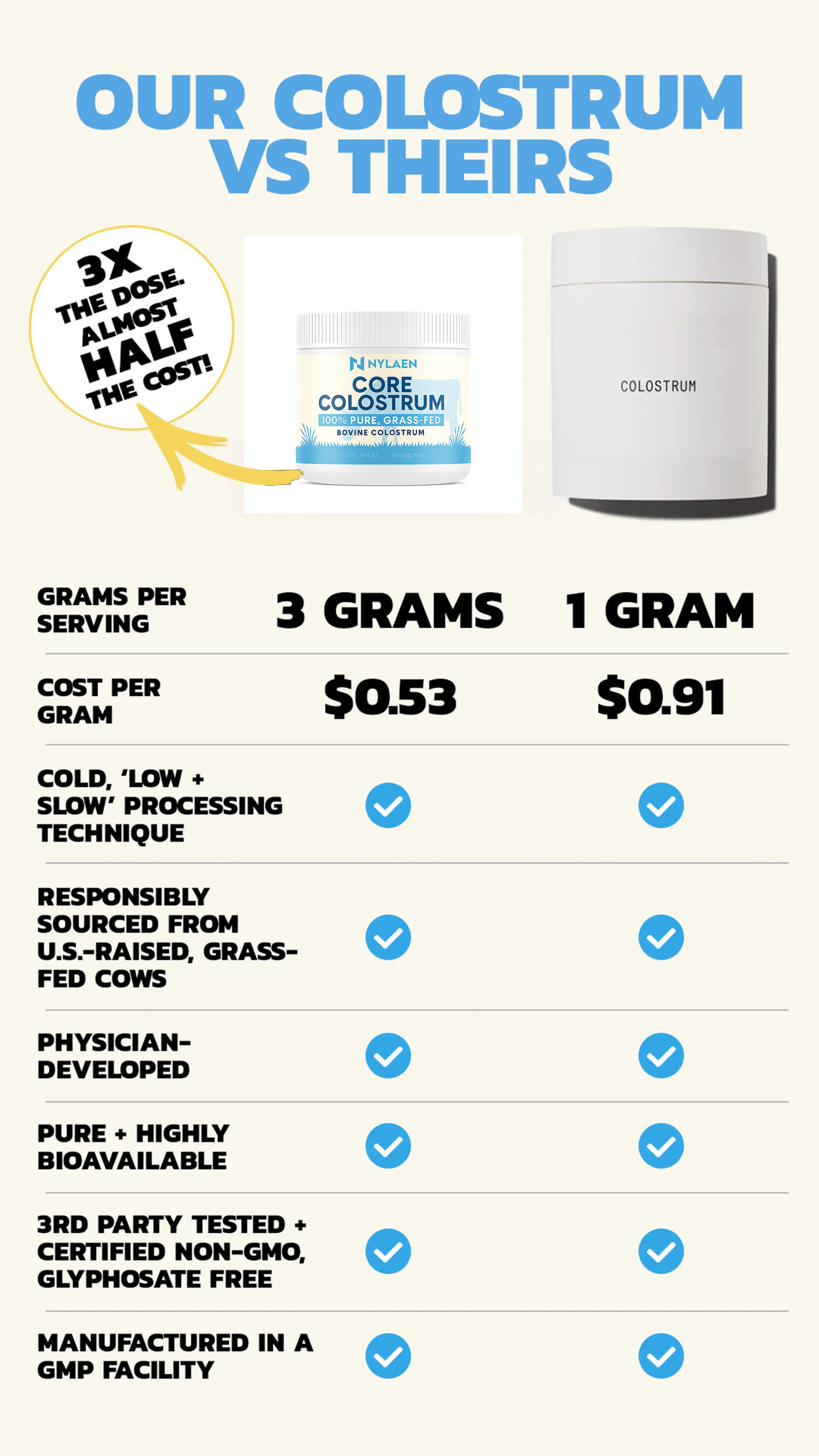 ourcing, dosage, and processing! Our Colostrum is sourced from grass-fed, pasture-raised farms across the US. It is third-party tested for pesticides, heavy metals, antibiotics and hormones. It also offers 3 grams per scoop compared to 1 gram in competitors’ products. Most studies showing colostrums benefits to gut health, immunity, recover and vitality have daily doses at 3g or more! Lastly, our colostrum is cold-processed to keep nutrients in tact!