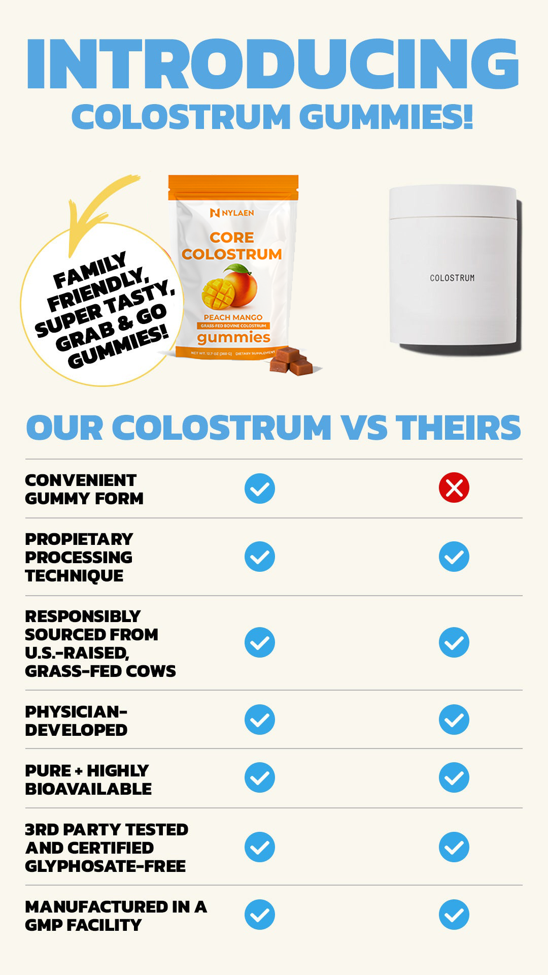Colostrum is most effective when taken consistently. We have designed Core Colostrum gummies to maximize convenience without sacrificing cleanliness or quality. Our gummies are a convenient alternative to traditional colostrum supplements, providing the easiest and most enjoyable way to consume colostrum.